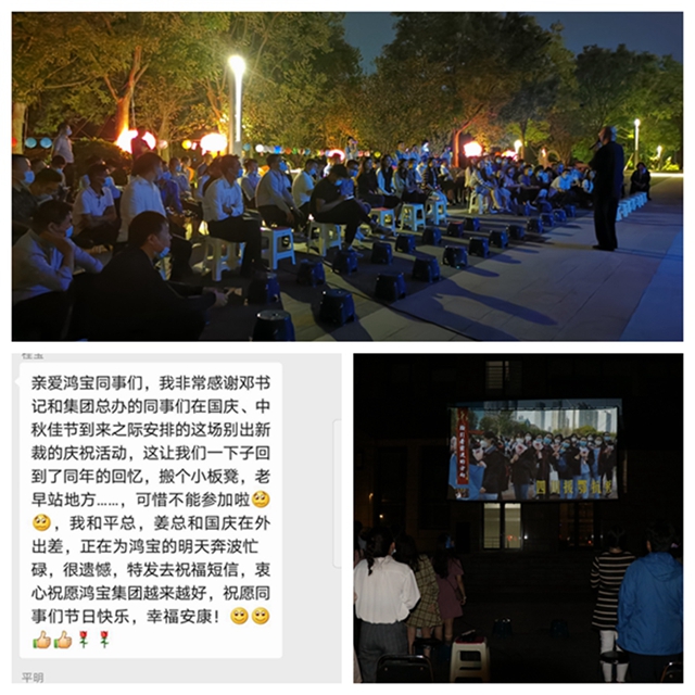 電影放映結束后,蘭考公司常務副總黃欽同志深情朗誦了宋朝大文學家蘇軾的《水調歌頭·明月幾時有》,集團公司黨委書記鄧總帶領大家共同重溫了《十五的月亮》《敖包相會》《世上只有媽媽好》《歌唱祖國》等金曲,并代表在外為鴻寶事業奔波奮斗的的袁董事長、平總集團高管向大家致以節日的問候。袁董事長雖不能親臨活動現場,但仍通過微信工作群向全體鴻寶人發來節日祝福和紅包,袁董事長回憶了童年觀看露天電影的美好回憶,與大家隔空相聚、共度佳節,并衷心祝愿鴻寶集團越來越好,祝愿鴻寶家人幸福安康!