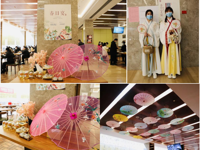 一抬頭,便能望見一排排撐開的花紙傘,伴隨著《煙雨江南》的詩意歌聲,讓人如同迎著春風(fēng),徜徉在江南雨巷之中。就餐人員在有序打餐之后,更是按捺不住心中喜悅,紛紛拍照打卡,記錄此刻美好。