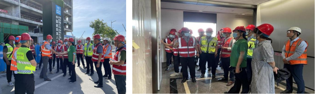 當天下午,曉曦總接待了浙江亞廈裝飾股份有限公司董事長丁澤成一行,對總部項目已施工完成的一層大堂、負一層電梯前室、三層公區精裝樣板區、景觀鋪裝樣板及外幕墻視覺模型進行查看,并聽取了精裝樣板的施工情況。
